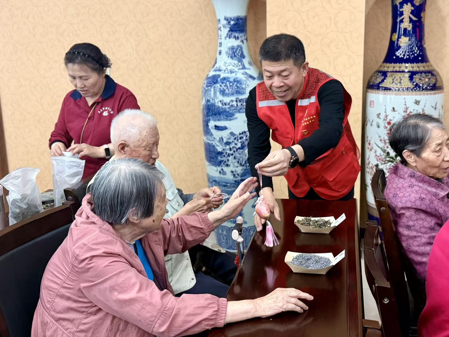 活动尾声,老人们和志愿者一起将亲手制作的香囊集中展示并合影留念,记录下这充满温情的瞬间。