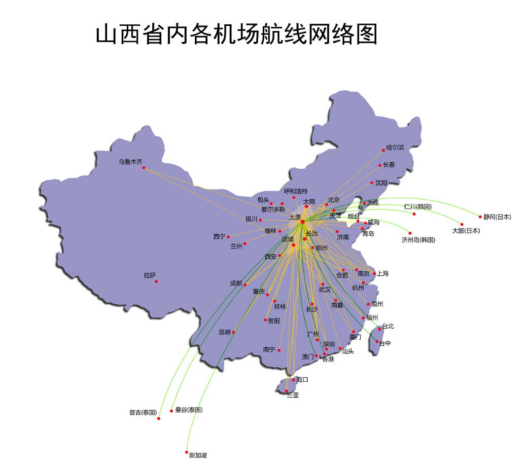 民航(見圖2:山西航線圖)方麵,省內有太原、大同、運城、長治四座機場,其中太原武宿國際機場可滿足當前最大機型A380等飛機的備降要求,有航班直達北京、廣州、上海、天津、海口等省會和主要城市40多個,已經開通了太原至香港定期航班、太原至臺北定期航班,並開通太原至日本、韓國、泰國、新加坡等國際客包機航線,以及太原經北京至倫敦、紐約、舊金山、巴黎、法蘭克福和太原經廣州至新加坡、吉隆坡、檳城等8條代碼共享國際航線。大同機場開通了至北京、廣州、上海、西安、武漢、鄭州、海口、烏魯木齊、長春、南京等城市的航班;長治王村機場到北京、上海、廣州、成都、西安以及省內的大同都有直達航班;運城關公機場到廣州、太原、深圳、天津等航線成為晉西南地區的航空中心。