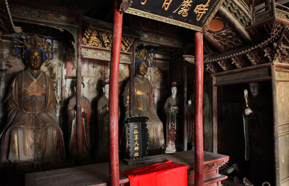 小南村二仙庙中的二仙塑像,是上党地区现存最早的且绝无仅有的宋代塑像。正殿内共有彩塑16尊,二仙真人并列主龛,两尊女官位于附龛内,另有侍女四尊、立像八尊。头戴凤冠,身着霞披的“二仙”主像高240厘米,宽78厘米,下着长裙,足穿云头靴,长袖及地,袖手端坐于几上。附龛内两尊女官手握笏板,恭侍站立。高约1.6米的掌文印、奉饮食、侍梳妆的女官、侍女像共12尊,分立二仙主像两侧。12尊塑像均着彩,服饰为宋代常见的绣罗裙、半臂、背子等,颈部系领巾、披画帛,头饰主要有朝天髻、包髻等。