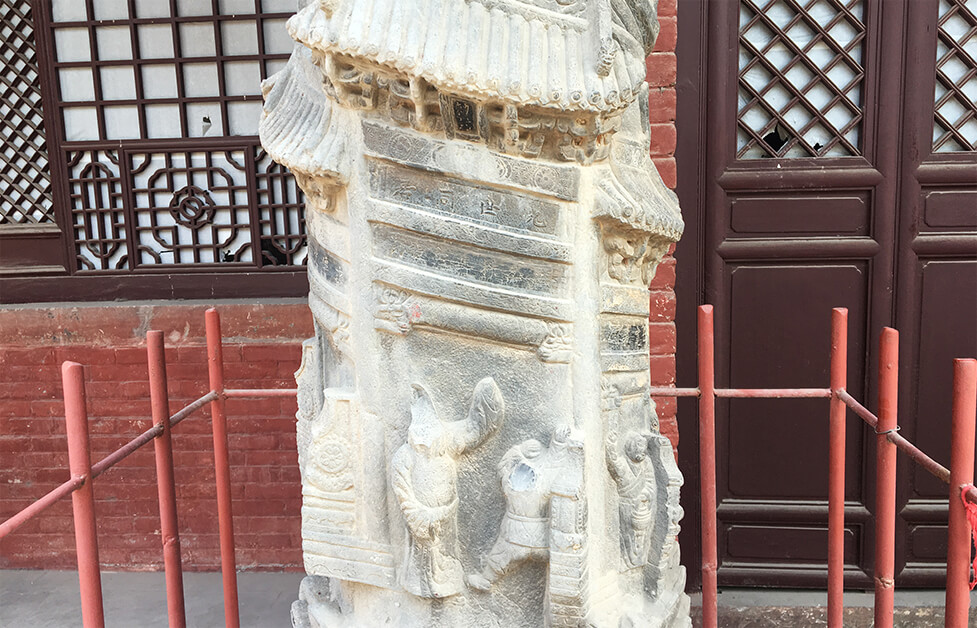 三义殿前廊上排列的四根人物石柱每根柱上都雕有人物故事。从东面往西看起:第一根石柱上雕刻的是人们熟悉的“郭子仪子婿拜寿”的场景片段:柱上“七子八婿,皆显贵朝廷”。郭子仪端坐堂上,喜形于色,享受着儿女们的孝道之心。在其周围,还有官员、女眷、士兵、家丁、童子、乐手等人物,姿态各异,栩栩如生。第二根石柱上人物更加丰富,从下到上处处分布着人物,主要故事为瓦岗寨的故事,立于城墙内的人物分别有持月牙板斧的瓦岗寨寨主程咬金,惯用杀手锏的秦琼,手拿梅花枪的罗成等。第三根柱子上雕刻的是悠然钓鱼的姜太公,踏着风火轮的哪吒三太子,凌空展翅的雷震子,游走地下的土行孙。第四根柱上,雕刻着盛唐时期山东寿张县百岁老人张公艺九世同堂和治家有方的故事。