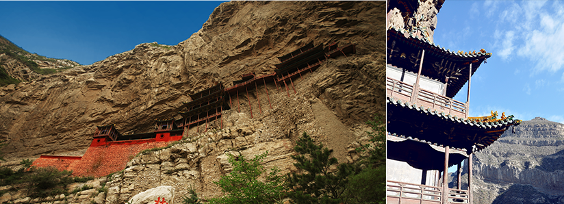 悬空寺被评为世界十大不稳定建筑之一,它有着“险、奇、巧、俏”四大特点。首先我们先来说险,险的惊心动魄。最高处的三教殿据史料记载原为97米,但是由于下面河床1500多年来的沙石沉积,以至于地表拔高,现存高度仅为43米。但就是这样,当您走入悬空寺的时候仍然会有一种身临空中楼阁的感觉。第二是奇,选址之奇,建筑之奇。工匠们没有花大力气去改造自然,而是充分的利用了岩壁上一个自然凹陷的空间,再结合对面天峰岭的地势,让悬空寺避免了风吹日晒落石雨淋。放眼望去偌大的悬空寺只有十几根碗口粗细的木柱在支撑着,而且这其中还有六到七根是可以晃动的虚柱根本不受力。就像民谣中所描述的那样。“悬空寺,半天高,三根马尾空中吊。”怎么样听我讲到这里,您是不是已经觉得它摇摇欲坠了呢?其实您不用担心,这里似危实安。因为这些木柱不仅是悬空寺的最后一重保险,也是它历时千年而不崩塌的秘密所在。真正的受力点并不在这里而是在一个“巧”字上。“半插飞梁为基,巧借岩石暗托。”整个悬空寺没有用过一颗铁钉加固,更没有用过一毫水泥灌浆。完全是徒手在岩壁上开山凿洞,然后打入横梁,以一个个的横梁作为地基凌空施工建造而成。一旦寺内游人人过多,当横梁的承载力达到临界点时,这些虚柱就会发挥出一柱顶千金的作用。第四,就是俏了,危中见俏。远看悬空寺好似一幅玲珑剔透的摩崖石刻,近观又好似天上宫阙有着凌空欲飞之势。鬼斧神工,如同天造地设令人叹为观止。