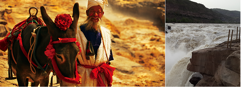 眼前就是闻名中外的黄河壶口瀑布了,黄河从高山流向大海,从远古流到今天,是高高的巴颜喀拉山脉孕育了她,她向东流经四川,甘肃,宁夏,在内蒙古托克托县河口镇,由于受到吕梁山脉阻挡,转南进入著名的晋陕大峡谷之中,上游数百米宽的浩瀚激流到达龙王山时,由于受到河床走势的影响,河水骤然收敛,涌动、翻腾、倾泻在石槽中,形成一个宽50米,落差30余米的巨大黄色瀑布,因其形似茶壶注水,故称“壶口瀑布”。