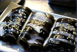 芝麻卷,全称黑芝麻卷,是香港特色甜食之一,使用黑芝麻、冰糖及马蹄粉做成粉浆,蒸好后再卷起而制成。由于外表呈黑色,像一卷菲林(底片),故有菲林卷的昵称。芝麻卷曾是满汉全席中一道菜。